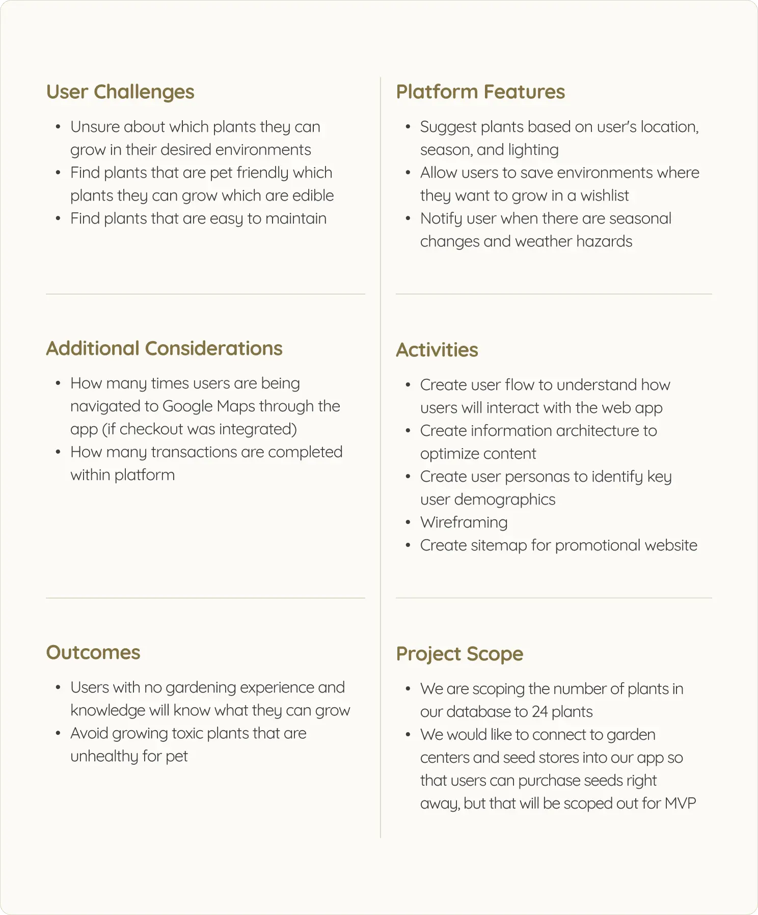 We will be solving the problem of users who are new to gardening not knowing what plants they can grow at home.